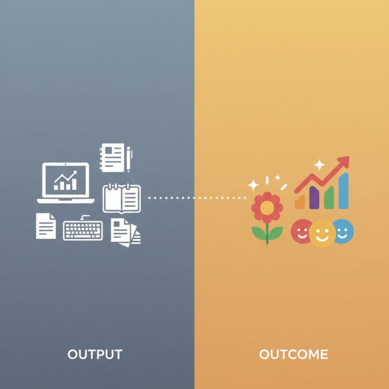 「アウトプット(出すこと)」と「アウトカム(もたらされる変化)」の違いを理解すると、仕事の優先順位がガラリと変わり、最小の努力で最大の評価を得られるようになります。